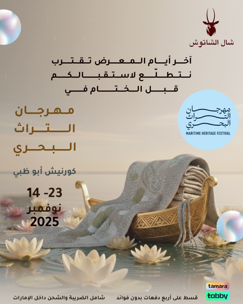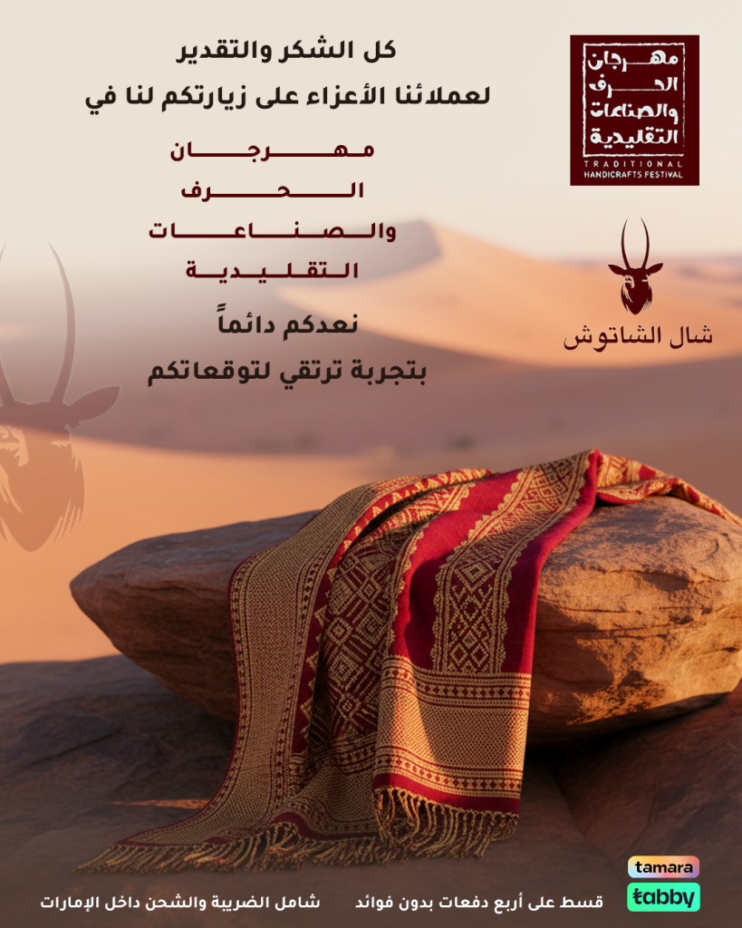 في شال الشاتوش نعتز بمشاركتنا في أكبر المعارض والمهرجانات التراثية في الإمارات، حيث نعرض الشالات الكشميرية الفاخرة المصنوعة يدويًا، ونقدم لزوّارنا تجربة أصيلة تجمع بين الفن والحرفة والجودة العالية.